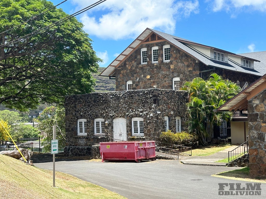 The dorm where Alexandra is staying is back on Oahu at Kawaiaha‘o Hall, located on the grounds of the Mid-Pacific Institute, a private school with a gated entrance and fencing surrounding the entire grounds. When we asked about entering, we were told advanced permission and an appointment is required for any photos. Kawaiaha‘o Hall is actually easily visible from Armstrong St, which is open to the public up to a gate. The angle seen in the film, however, is from the opposite side, down on a field.