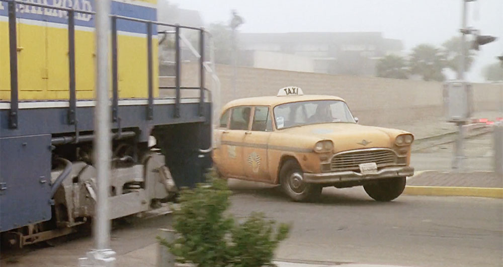 Exterior – Taxi almost crashes into train